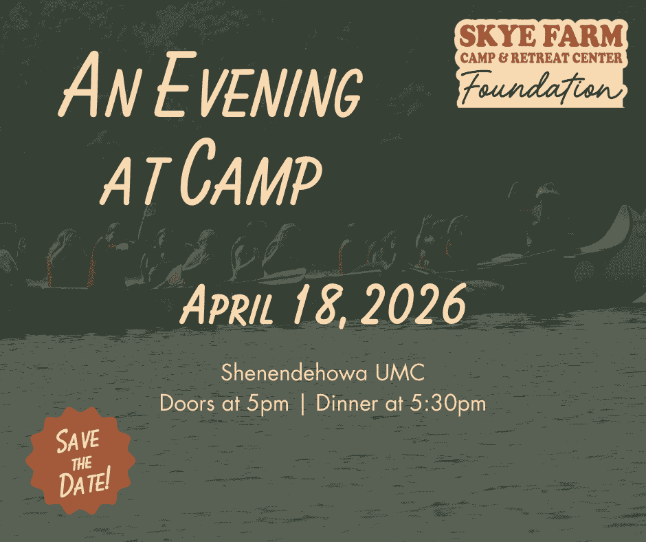 On April 18th, the Skye Farm Foundation is throwing their annual fundraising dinner: An Evening at Camp at Shenendehowa United Methodist Church. We’ll be sharing a delicious meal prepared by familiar faces from the Skye Farm kitchen, listening and singing along with Skye Farm musicians, browsing new camp merchandise, and raising funds to support the long-term future of Skye Farm.