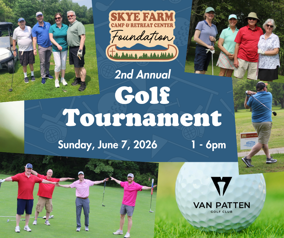 The Skye Farm Foundation’s 2nd Annual Golf Tournament is Sunday, June 7th! Join us for 9 holes of golf at the Van Patten Golf Club in Clifton Park, NY, and/or support the event with your business and sponsor a tee, a contest, or more. We’ll be doing a shotgun start, scramble format, with “closest to the pin” and “longest drive” contests and a variety of prizes. Registration starts at 1pm, followed by 2pm tee time, and a 5pm casual dinner reception. Your support of this event will help Skye Farm continue to fill kids’ summers with smiles, friendship, adventure and loving Christian community.