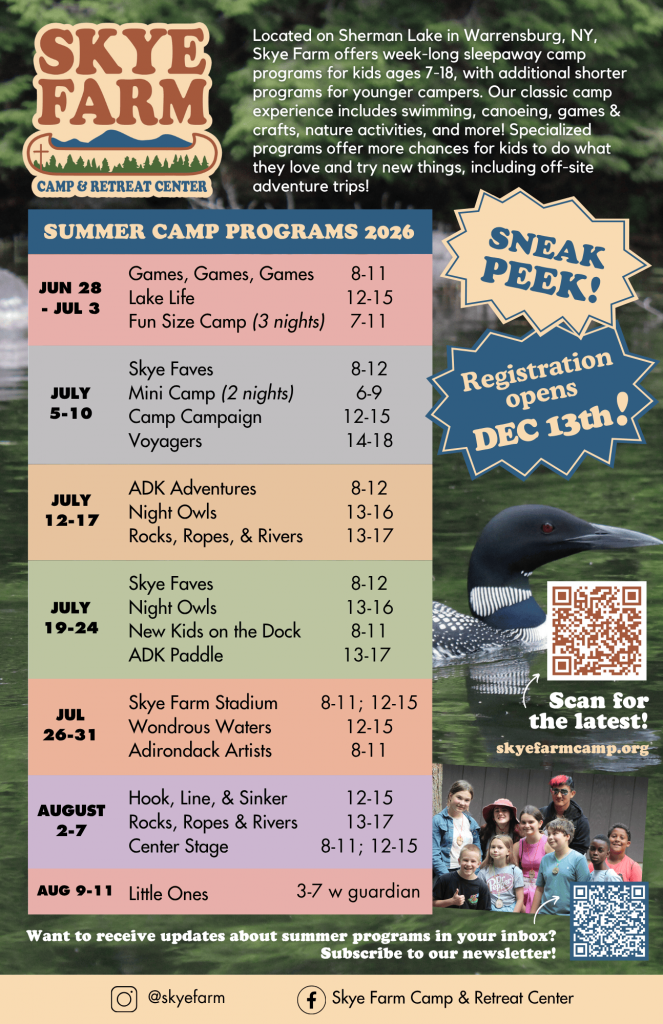 Find adventure in the 400+ acres of Skye Farm’s forest, trails, streams and views. Learn about the natural world of the Adirondacks from local experts, spend a night in a tent or hammock, and have lots of classic camp fun!