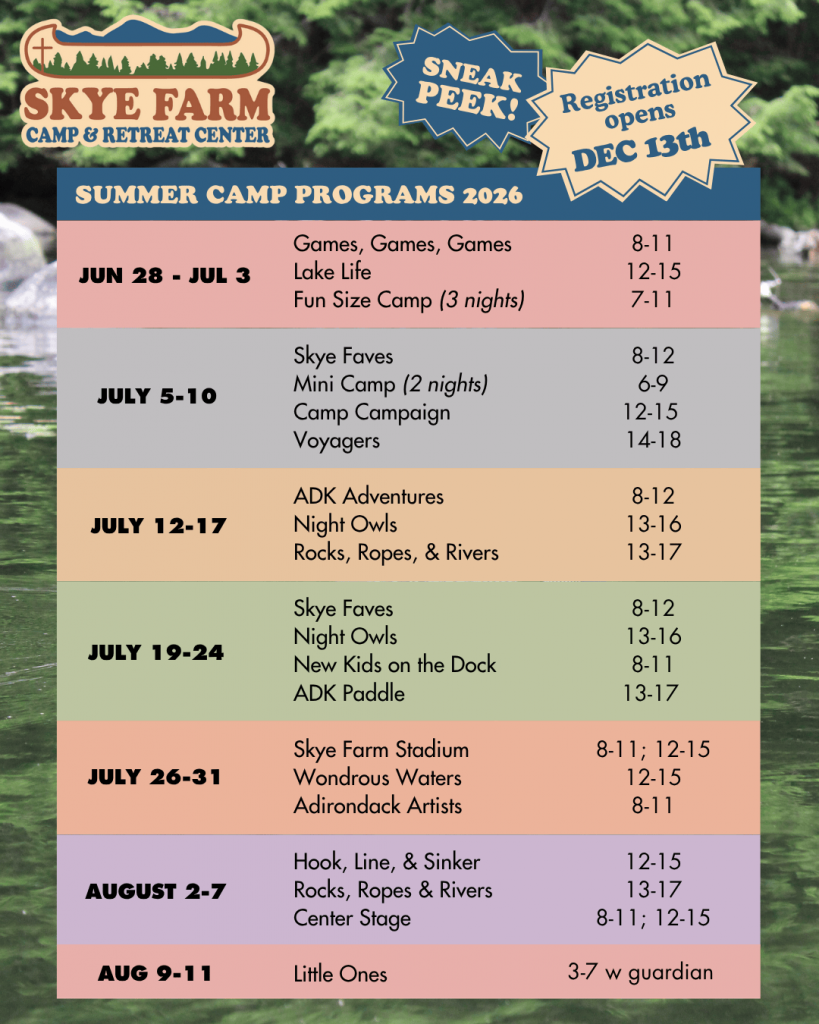 Find adventure in the 400+ acres of Skye Farm’s forest, trails, streams and views. Learn about the natural world of the Adirondacks from local experts, hang out in hammocks, and have lots of classic camp fun!